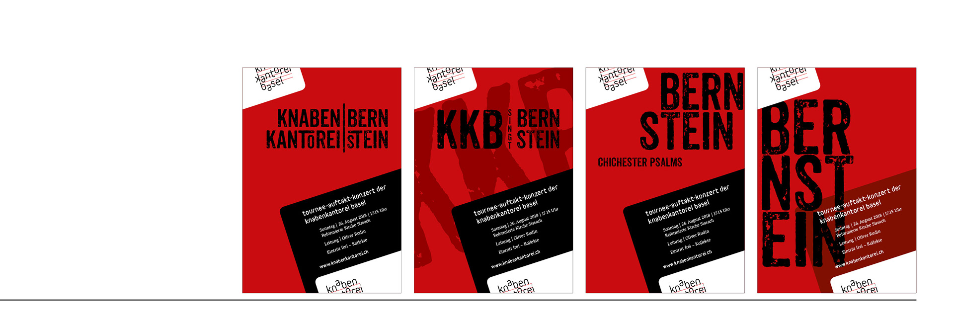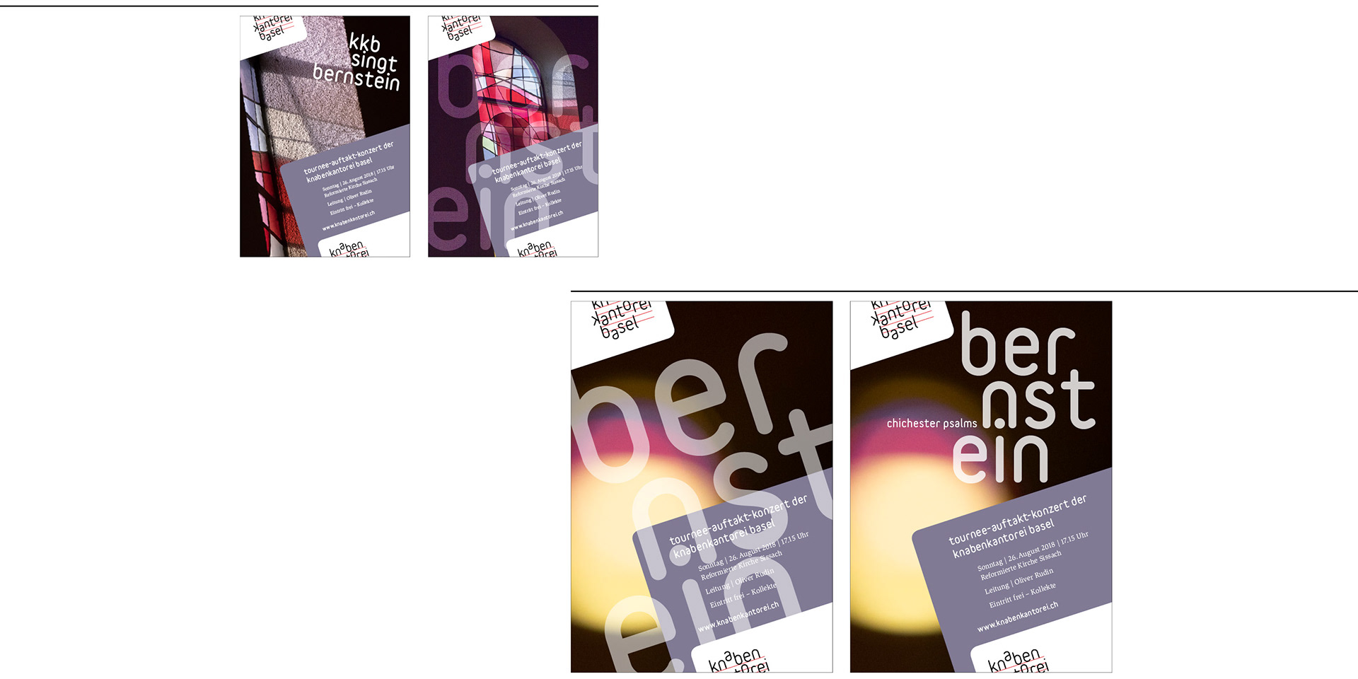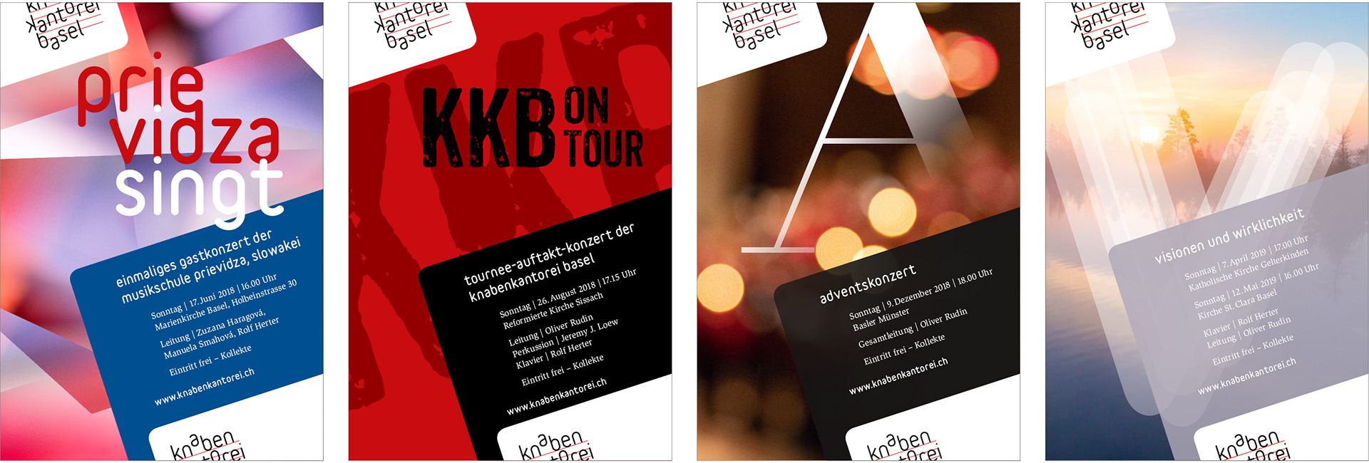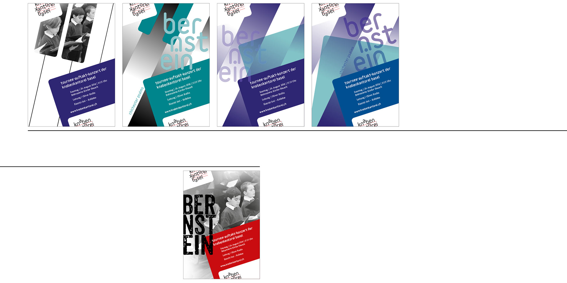 Die singenden Knaben zeigen ihr Können an mehreren Konzerten pro Jahr. Die Gestaltung der Flyer und Plakate darf ich in meiner Zeit bei Schaffner & Conzelmann übernehmen. Neben den vorgegebenen Elementen vom Corporate Design, welche das Logo, die Schrift und die schrägen Flächen beinhalten, soll das Erscheinungsbild zum Konzertprogramm passen.