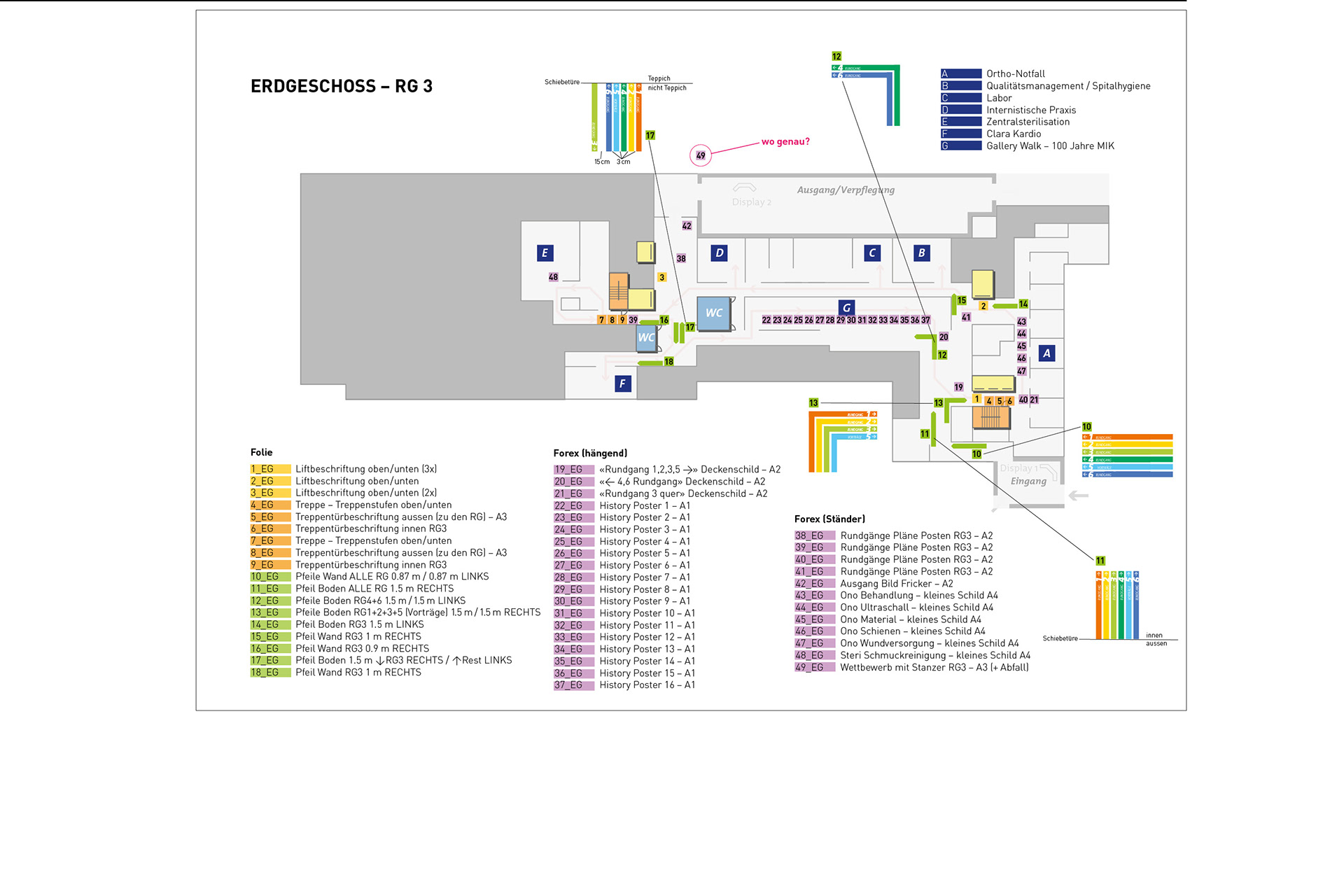 Als weitere wegweisende und informative Elemente werden auf allen Rundgängen Forex-Schilder platziert. Ich bin hier Teil des gestaltenden Teams. Meine Aufgabe beim Anbringen der Forex-Platten ist das Ordnen nach Stockwerken und das Behalten des Überblicks in diesem Schilder-Wald. Auch bei der Montage helfe ich mit.