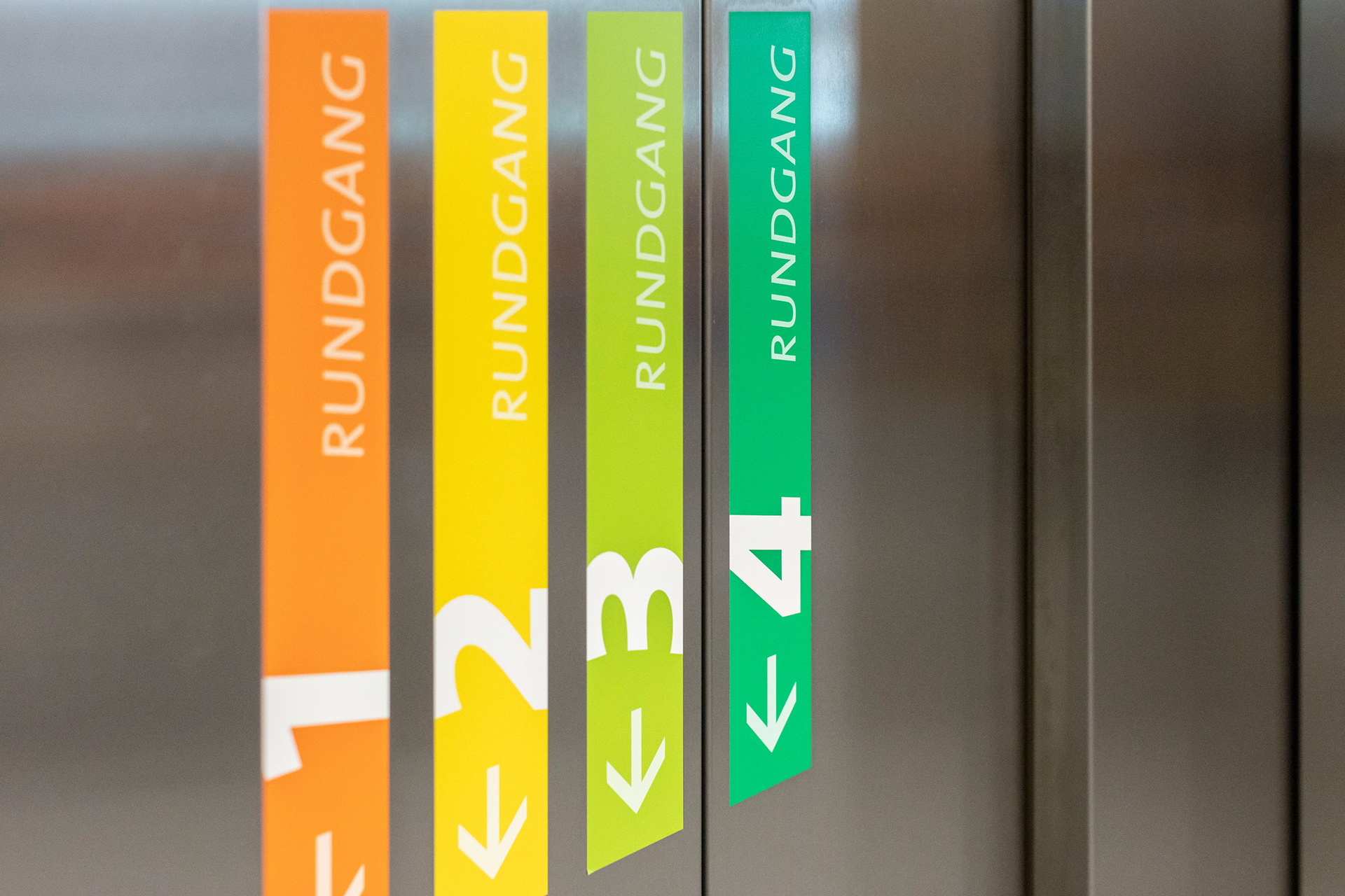 Die Besucher sollen sechs Rundgänge auf sechs verschiedenen Stockwerken besuchen können. Ziel der Signaletik ist es, die Besucher auf eine einfache, aber ansprechende Art zu ihrem Ziel zu lotsen und ihnen dadurch ein erfreuliches Erlebnis zu bieten.
